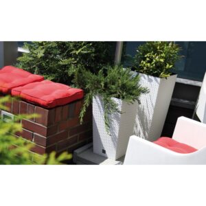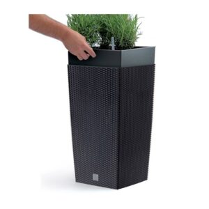 Wysoka doniczka Rato Square o fakturze wiernie imitującej plecionkę z naturalnego rattanu, w klasycznej, czystej formie, pozwala kreować piękne unikatowe wnętrza i bez ograniczeń aranżować przestrzeń wokół domu, godząc różne style i upodobania. Jej funkcjonalność wyraża się również w komforcie użytkowania bez względu na aurę. W zestawie z wkładem.