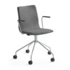 Eleganckie krzesło konferencyjne z podstawą 5-ramienną i pięcioma kołami. Siedzisko zintegrowane z oparciem. Krzesło tapicerowane wytrzymałą tkaniną. Wyposażone w smukłe podłokietniki. Elegancki design sprawia, że krzesło to stylowy dodatek do sali konferencyjnej. To stylowe krzesło konferencyjne doda atrakcyjności każdej sali konferencyjnej. Krzesło posiada siedzisko zintegrowane z oparciem oraz miękką wyściółkę zapewniającą wygodę nawet podczas długich narad. Oparcie delikatnie profilowane, siedzisko z zaokrągloną przednią krawędzią dla dodatkowego komfortu. Siedzisko jest wyściełane i tapicerowane trwałą tkaniną.