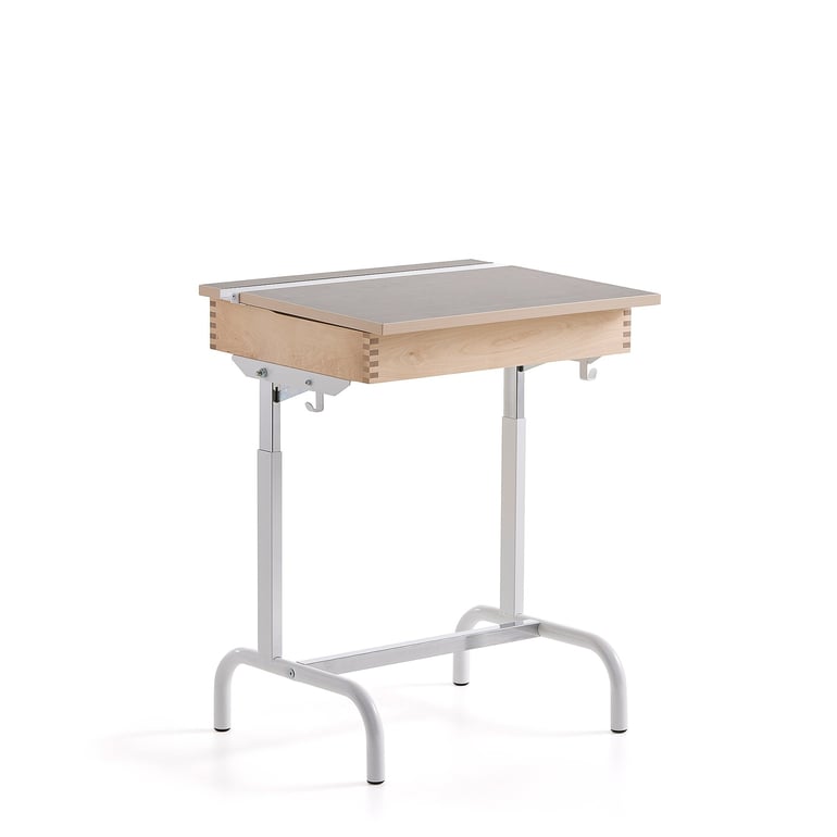 Ławka szkolna z ręczną regulacją wysokości. Blat posiada dźwiękochłonną powierzchnię. Klasyczna ławka szkolna o nowoczesnym designie. Sprawdzi się w trudnych warunkach szkolnych. Elastyczna rama pozwala łatwo dostosować ławkę do krzesła i użytkownika.