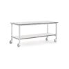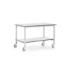 Stół posiada koła skrętne dla maksymalnej funkcjonalności. Pozwala to na użytkowanie stołu jako mobilnego stanowiska pracy z możliwością przemieszczenia, gdy zajdzie potrzeba. Blat jest niezwykle stabilny. Spoczywa na ramie wykonanej z rur stalowych o kwadratowym przekroju. Wysoka trwałość ramy pozwala na intensywne użytkowanie w trudnych środowiskach. Ręczna regulacja wysokości przy pomocy ceowników. Rama pokryta trwałym lakierem proszkowym w kolorze czarnym. Stół posiada blat w laminatu HPL o grubości 24 mm. Blat w kolorze buku, listwa ochronna na krawędzi blatu z ciemnoszarego tworzywa ABS. Maksymalne równomierne obciążenie 400 kg.