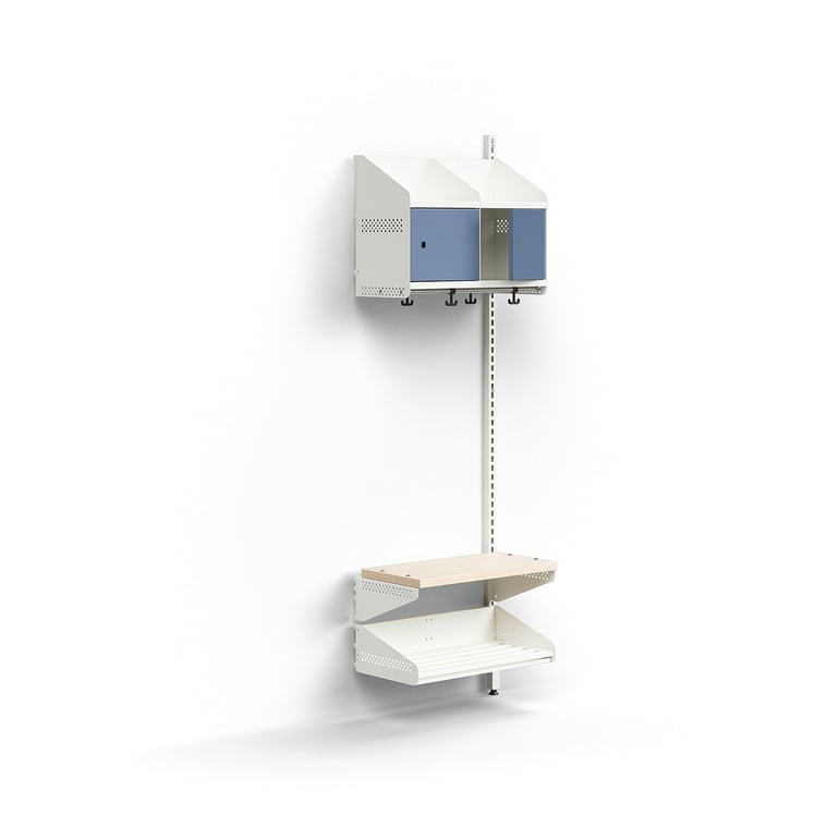 Moduł dodatkowy stojaka ENTRY na obuwie i nakrycia głowy. W komplecie z górną półką, sekcją z przegrodami, ławką i stojakiem na buty z ociekaczem oraz szyną ścienną. Przed dodaniem modułów dodatkowych należy zainstalować ścienny moduł podstawowy. ENTRY to funkcjonalna seria do szatni z możliwością rozbudowy, w której każdą część można dostosować do potrzeb. Rozbuduj moduł podstawowy o ten stojak na nakrycia głowy i obuwie, aby stworzyć miejsce do przechowywania, które dobrze komponuje się z otoczeniem. Idealny wybór do szkolnej lub przedszkolnej szatni!