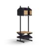 Stojak na nakrycia głowy i buty jest dostarczany w komplecie z przegrodami, podwójnymi haczykami, górną półką, ławką i półką na buty. Półka na buty została wykonana z okrągłych rur stalowych, co zapobiega zbieraniu się kurzu. W części dolnej znajduje się ociekacz, który zbiera piach i wodę z obuwia. Ławka jest idealna do zdejmowania i zakładania butów przez dzieci.