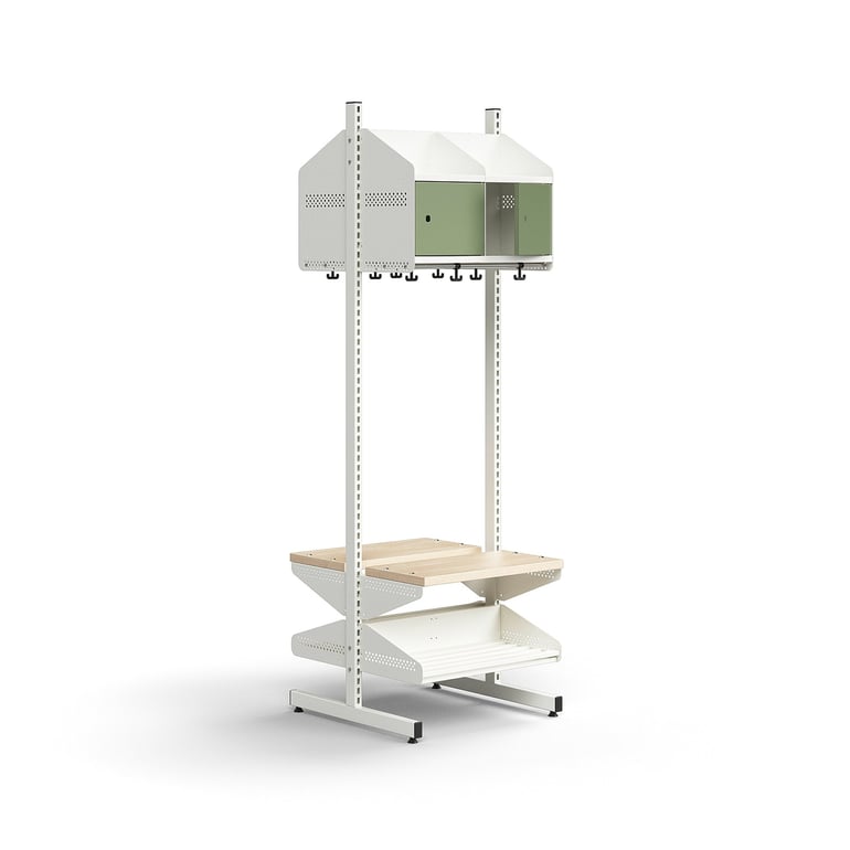 Dwustronny stojak na nakrycia głowy i na obuwie z ociekaczem i praktyczną ławką. Można łatwo rozbudować, dodając kilka modułów z serii ENTRY, aby stworzyć rozwiązanie do przechowywania dostosowane do potrzeb. Wyposażony w dwie ramy typu T i stężenia krzyżowe. ENTRY to wszechstronna seria do szatni z możliwością rozbudowy, w której każdą część można dostosować do potrzeb. Ta jednostka podstawowa idealnie nadaje się do szkolnej lub przedszkolnej szatni. Za pomocą modułów dodatkowych można łatwo rozbudować miejsce do przechowywania odzieży i obuwia oraz dostosować je do konkretnej przestrzeni.