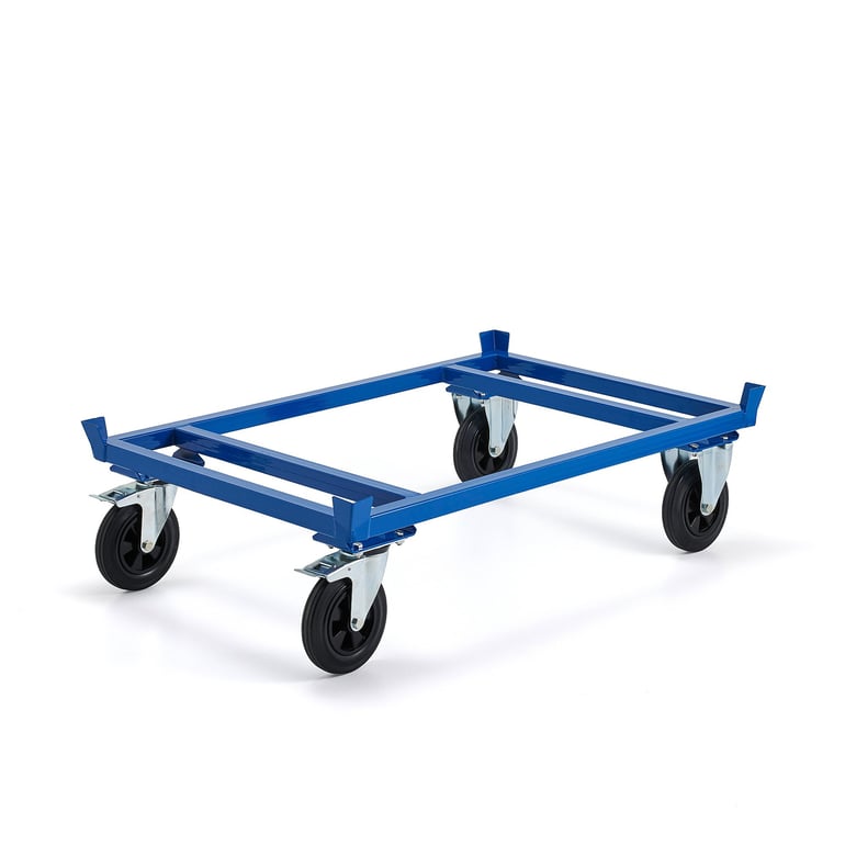 Wózek ma solidną konstrukcję i jest wykonany z rur stalowych lakierowanych proszkowo. Cztery narożne uchwyty o wysokości 75 mm zapobiegają spadaniu palet z wózka. Dwa koła skrętne ułatwiają manewrowanie.