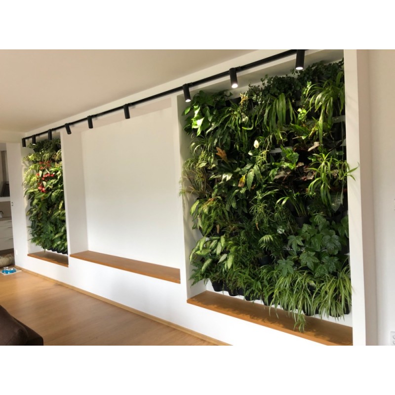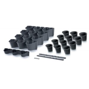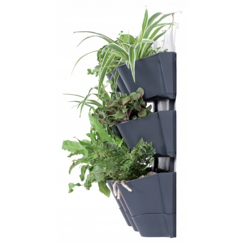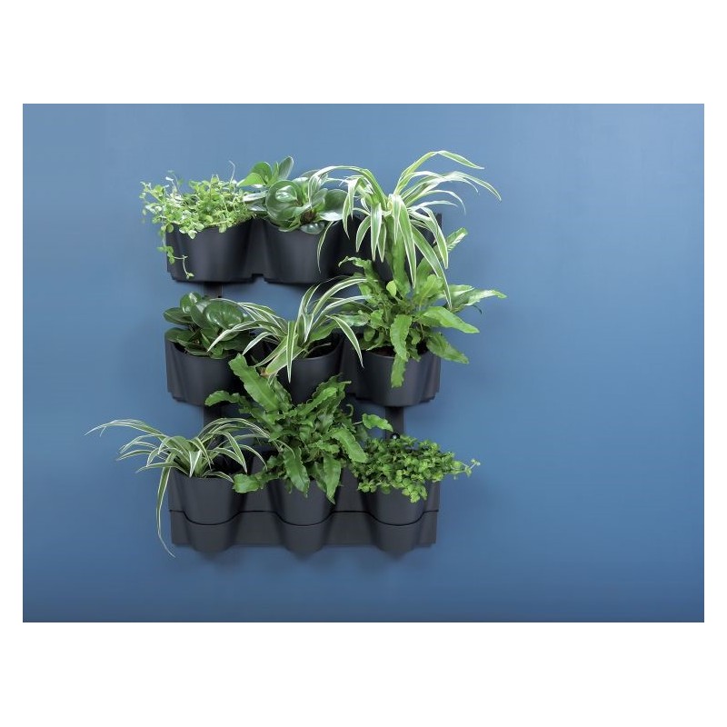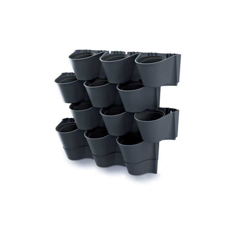 Zestaw zawiera 4 rzędy pionowych doniczek i 12 doniczek wewnętrznych, spodek, 2 szyny do zawieszania.
