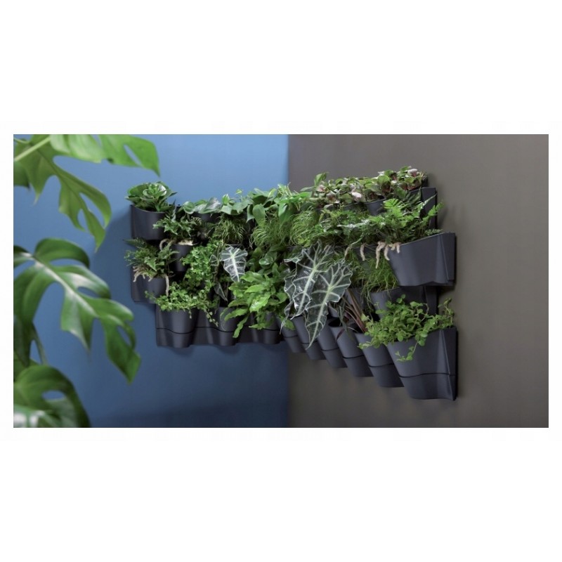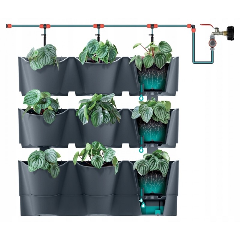 Dzięki przepływowemu systemowi nawadniania rośliny są równomiernie zaopatrywane w wodę. Nadmiar wody jest odprowadzany do misy. Modułowy system uprawy doniczek CASCADE WALL daje nam możliwość tworzenia zielonych ścian z warzyw, ziół i kwiatów nawet na niewielkiej powierzchni.