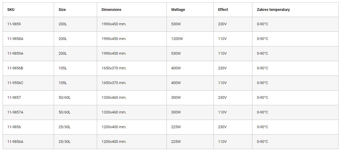- Czas trwania ogrzewania: ok. 24 godz. (200 l wody od +20ºC do +80ºC przy użyciu ogrzewacza beczek o mocy 1200 W)