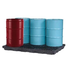 Wykonana z bardzo trwałego i odpornego na chemikalia polietylenu, w 100% pozyskanego z surowców wtórnych, dzięki czemu podwójnie przyczynia się do ochrony środowiska. Nie tylko zapobiega przed skutkami niekontrolowanych wycieków, ale także umożliwia zagospodarowanie odpadów surowcowych, które w przeciwnym razie zanieczyściłyby środowisko. Doskonale nadaje się do składowania akumulatorów oraz beczek i pojemników z olejami, czy chemikaliami nawet tymi najbardziej agresywnymi. Jest stosowana do stałego wychwytywania wycieków lub jako miejsce dozowania płynów z pojemników i beczek. Opcjonalne zaciski łączące (28926) pewnie łączą moduły palet (wanien) ze sobą dla stworzenia wspólnej platformy roboczej. W przypadku konieczności utworzenia wzajemnego połączenia między modułami, oferowany jest zestaw przelewowy (28927), który pozwala na połączenie modułów dla zwiększenia całkowitej pojemności wychwytowej zespołu. Opcjonalna rampa podjazdowa (28650), mocowana do modułu za pomocą zaczepów, o małym kącie nachylenia, ułatwia ustawianie i zdejmowanie ciężkich beczek przy pomocy wózków. Antypoślizgowe żebrowanie rampy oraz platformy roboczej zapewnia bezpieczną eksploatację beczek i pojemników. Czarny kolor ukrywa zabrudzenia i sprawia, że środowisko pracy wygląda schludnie. Mocna, samoustawiająca się kratownica o grubości 64 mm, jest nieprzesuwna i łatwo zdejmuje się do czyszczenia. Spełnia wymogi przepisów EPA, SPCC, OSHA, NFPA1 oraz międzynarodowych przepisów przeciwpożarowych. Posiada „zielony” certyfikat wydany przez UL Environment. Wymiary D*S*W 1854 x 1245 x 140 mm, pojemność wychwytowa 276 l, waga 41 kg, nośność 3402 kg, magazynowanie 6*200 l, kolor czarny.