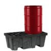 Wykonana z bardzo trwałego i odpornego na chemikalia polietylenu, w 100% pozyskanego z surowców wtórnych, dzięki czemu podwójnie przyczynia się do ochrony środowiska. Nie tylko zapobiega przed skutkami niekontrolowanych wycieków, ale także umożliwia zagospodarowanie odpadów surowcowych, które w przeciwnym razie zanieczyściłyby środowisko. Doskonale nadaje się do składowania akumulatorów oraz beczek i pojemników z olejami, czy chemikaliami nawet tymi najbardziej agresywnymi. Jest stosowana do stałego wychwytywania wycieków lub jako miejsce dozowania płynów z pojemników i beczek. Opcjonalne zaciski łączące (28926) pewnie łączą moduły palet (wanien) ze sobą dla stworzenia wspólnej platformy roboczej. W przypadku konieczności utworzenia wzajemnego połączenia między modułami, oferowany jest zestaw przelewowy (28927), który pozwala na połączenie modułów dla zwiększenia całkowitej pojemności wychwytowej zespołu. Opcjonalna rampa podjazdowa (28650), mocowana do modułu za pomocą zaczepów, o małym kącie nachylenia, ułatwia ustawianie i zdejmowanie ciężkich beczek przy pomocy wózków. Antypoślizgowe żebrowanie rampy oraz platformy roboczej zapewnia bezpieczną eksploatację beczek i pojemników. Czarny kolor ukrywa zabrudzenia i sprawia, że środowisko pracy wygląda schludnie. Mocna, samoustawiająca się kratownica o grubości 64 mm, jest nieprzesuwna i łatwo zdejmuje się do czyszczenia. Spełnia wymogi przepisów EPA, SPCC, OSHA, NFPA1 oraz międzynarodowych przepisów przeciwpożarowych. Posiada „zielony” certyfikat wydany przez UL Environment. Wymiary D*S*W 1854 x 1245 x 140 mm, pojemność wychwytowa 276 l, waga 41 kg, nośność 3402 kg, magazynowanie 6*200 l, kolor czarny.