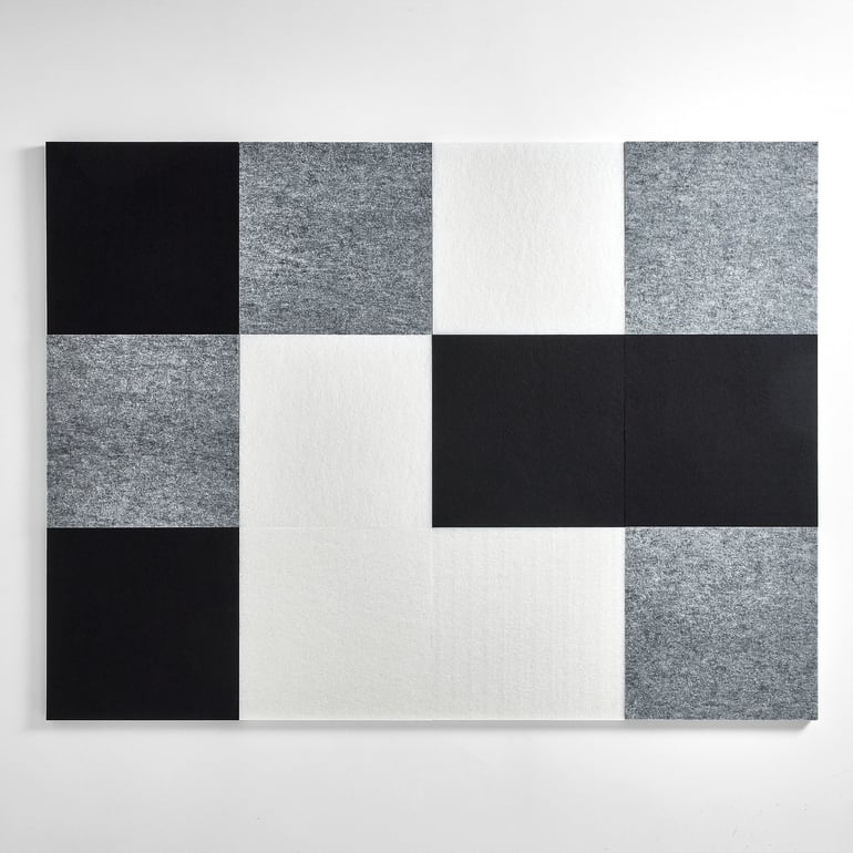 Opakowanie zawiera po cztery szare, białe i czarne panele akustyczne. Można je łatwo łączyć z innymi panelami o różnych wzorach, aby tworzyć pomysłowe kompozycje i jeszcze bardziej poprawić środowisko akustyczne w miejscu pracy.