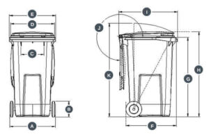 Mobilne plastikowe kontenery na odpady segregowane o pojemności 240 litrów, wyposażone w kółka ułatwiające przemieszczanie. Posiadają różne kolory, co ułatwia segregację odpadów. Wykonane z trwałego polietylenu wysokiej gęstości, odpornego na promieniowanie UV, deszcz oraz roztwory kwaśne i alkaliczne.