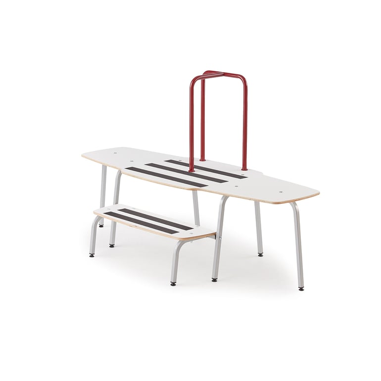 Podest do przebieralni, wykonany ze sklejki. Antypoślizgowa powierzchnia z laminatu w kolorze białym. Praktyczny podest do przebierania to konieczność w przedszkolnej szatni. Podest Praktisk ułatwia proces przebierania zarówno z perspektywy dziecka, jak i dorosłego. Zapewnia ergonomiczną postawę i chroni przed nadmiernym napięciem mięśni. Idealny do małych i dużych szatni. Produkt wykonany ze sklejki brzozowej lakierowanej proszkowo na kolor srebrnoszary. Powierzchnia z białego laminatu. Właściwości antypoślizgowe. Podest wyposażony w podpórkę/uchwyt, ułatwiający dziecku utrzymanie równowagi podczas przebierania. Pomieści kilkoro dzieci jednocześnie.