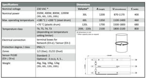 Seria podgrzewaczy bębnów ATEX jest dostępna w różnych rozmiarach i konfiguracjach bębnów, dostosowanych do różnych typów bębnów i wymiarów, i może być używana do podgrzewania różnych materiałów, w tym cieczy, past i ciał stałych. Dostępne standardowe rozmiary obejmują beczki 30L, 60L, 120L i 200-220L. Grzejniki bębnowe występują w różnych wydajnościach i mocach nominalnych, w zależności od wielkości podgrzewanego bębna. Grzałki można stosować dla klas temperaturowych T6, T5, T4, T3 w zależności od ustawienia temperatury ogranicznika.