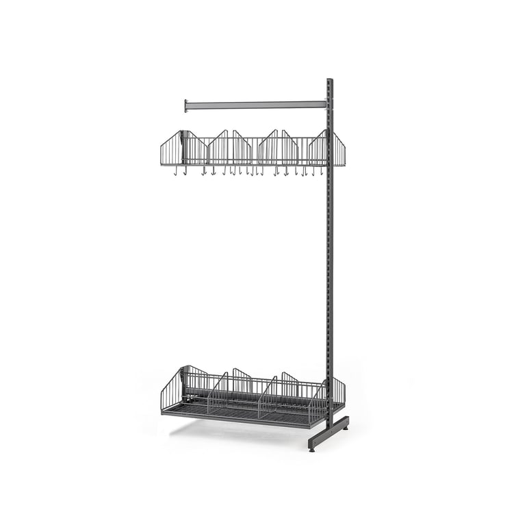 Wyposażony w podwójną ramę w kształcie T, półkę na nakrycia głowy z 3 przegrodami oraz stojak na obuwie. Przegrody w rozmiarze dostosowanym, aby pomieścić czapki, szaliki i rękawiczki oraz inne niewielkie przedmioty. Stojak na buty zapewnia przestrzeń do przechowywania obuwia i został wyposażony w ociekacz, który chroni podłogę przed wilgocią. Wieszak jest przeznaczony do montażu na ścianie, co sprawia, że doskonale nadaje się do ciasnych przestrzeni i ułatwia sprzątanie w pomieszczeniu. Seria posiada również gamę akcesoriów dodatkowych, takich jak stojaki na obuwie, ławki, listwy z haczykami i wiele innych!