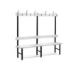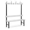 Pojedyncza ławka z oparciem i szynami oraz hakiem po obu stronach Mocne i solidne ławki do szatni. Idealnie zaoszczędzają miejsce i są idealnym rozwiąniem na umieszczenie w środku pomieszczenia jak i pod ścianą. Zastosuj ławki w szatniach pojedynczo lub stwórz moduły składajace sie z wielu parti- możliwości są nieograniczone. Projekt jest prosty, ale ławka jest mocna i stabilna, aby wytrzymać silne ścieranie i codziene użytkowanie. Rama wykonana jest z wytrzymałej rurki stalowej pokrytej trwałą powłoką malowaną proszkowo. Każda sekcja ma bardzo wytrzymałą podstawę. Siedzenie, oparcie i szyna haka wykonane są z wytrzymałego, szarego laminatu wysokociśnieniowego. Haki są galwanizowane i oferują wiele opcji przechowywania np. na ubrania, ręczniki, torby i inne.
