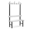 Pojedyncza ławka z oparciem i szynami oraz hakiem po obu stronach Mocne i solidne ławki do szatni. Idealnie zaoszczędzają miejsce i są idealnym rozwiąniem na umieszczenie w środku pomieszczenia jak i pod ścianą. Zastosuj ławki w szatniach pojedynczo lub stwórz moduły składajace sie z wielu parti- możliwości są nieograniczone. Projekt jest prosty, ale ławka jest mocna i stabilna, aby wytrzymać silne ścieranie i codziene użytkowanie. Rama wykonana jest z wytrzymałej rurki stalowej pokrytej trwałą powłoką malowaną proszkowo. Każda sekcja ma bardzo wytrzymałą podstawę. Siedzenie, oparcie i szyna haka wykonane są z wytrzymałego, szarego laminatu wysokociśnieniowego. Haki są galwanizowane i oferują wiele opcji przechowywania np. na ubrania, ręczniki, torby i inne.