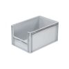 Pojemnik magazynowy 400x300x220 w wersji z oknem inspekcyjnym na krótkim boku. W ten sposób można w łatwy sposób wyjąć towar z pojemników ułożonych w stos.