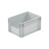 Pojemnik magazynowy 600x400x320 w wersji z oknem inspekcyjnym na krótkim boku. W ten sposób można w łatwy sposób wyjąć towar z pojemników ułożonych w stos.