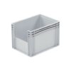 Pojemnik magazynowy 400x300x320 w wersji z oknem inspekcyjnym na krótkim boku. W ten sposób można w łatwy sposób wyjąć towar z pojemników ułożonych w stos.