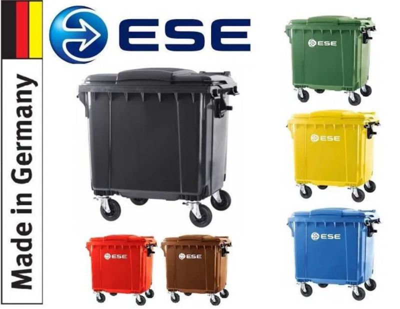 Pojemnik na odpady komunalne 1100l selektywne ESE, zgodny z normą PN-EN 840. Oznaczony znakiem jakości RAL-GZ951/1 oraz spełniający wymogi Unii Europejskiej. Wyjątkowy pojemnik niemieckiej marki ESE cechuje się wysoką jakością, trwałością i estetyką. Posiada płaską, lekką klapę oraz cztery gumowe koła z hamulcami, zapewniające wygodę użytkowania i cichą eksploatację.