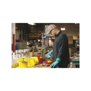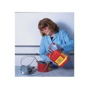 Pomaga szybko i łatwo zwilżyć szmatki lub ściereczki. Naciśnięcie na mosiężną pompkę powoduje napełnienie górnej miseczki odmierzoną ilością płynu służącego do nasączania tkanin. Nadmiar płynu spływa bezpiecznie z powrotem do wnętrza pojemnika. Perforowane sito służy także jako pułapka przeciwogniowa. Miseczka ma uniesione brzegi, zabezpieczające płyn przed rozlaniem. Pojemnik wykończony trwałym lakierem proszkowym, odpornym na działanie chemikaliów. Posiada certyfikat FM Global, TUV.