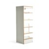 Regał do biblioteki oferuje prosty skandynawski design, z białą ramą z laminatu HPL i dębowymi krawędziami. W każdej sekcji dodatkowej znajdują się półki wykonane z blachy, które są wyposażone w zagięte obrzeża. Pozwala to na przechylenie półek i wykorzystanie ich do prezentowania tytułów książek lub przechowywania gazet i czasopism.