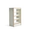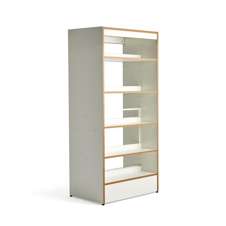 Regał do biblioteki oferuje prosty skandynawski design, z białymi ramami z laminatu HPL i dębowymi krawędziami. Półki wykonane są z blachy i wyposażone w zagięte krawędzie. Pozwala to na przechylenie półek i wykorzystanie ich do prezentowania tytułów książek lub przechowywania gazet i czasopism.