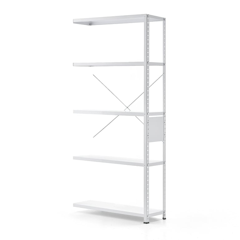 Moduł dodatkowy dostarczany jest z pięcioma półkami. Łatwa regulacja wysokości półek w odstępach co 40 mm dla większej funkcjonalności. Podobnie jak moduł podstawowy, moduł dodatkowy jest wykonany z blachy stalowej i oferuje wzmocnioną konstrukcję ze stężeniem krzyżowym i jedną ramą końcową po stronie wolnostojącej. Regał jest wyposażony również w stopki, które zapobiegają zarysowaniu podłogi.