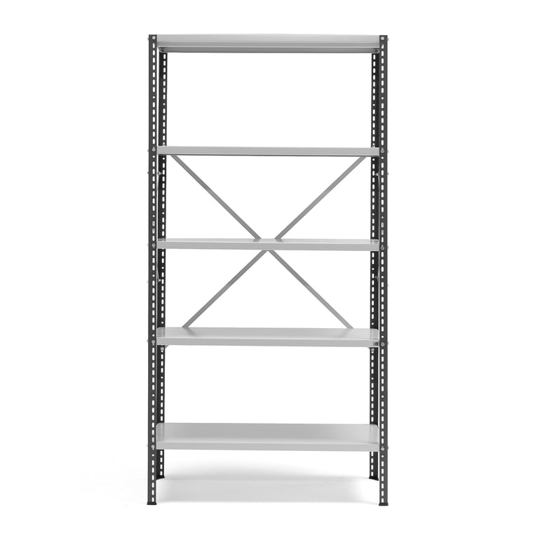 Regał z 2 stężeniami bocznymi i stężeniem tylnym dla dodatkowej stabilności. Wyposażony w regulowane półki ze spawanymi szynami wzmacniającymi. Nasz stabilny regał wykonano z blachy stalowej lakierowanej proszkowo. Wykończenie lakierem proszkowym zapewnia optymalną wytrzymałość i odporność na uderzenia. Doskonały w szczególności do magazynów. Sprawdzi się także w biurach itp. Półki wyposażono w spawane szyny wzmacniające, dzięki którym każda półka wytrzymuje maksymalne obciążenie 170 kg. Montaż regału wymaga śrub. Półki można montować na dowolnej wysokości oraz przestawiać w górę i w dół zgodnie z potrzebą. Słupki wyposażono w plastikowe stopki, które chronią podłogę przed uszkodzeniami. System regałów można łatwo rozbudować w poziomie przy pomocy dowolnej liczy modułów dodatkowych (sprzedawane oddzielnie, patrz akcesoria).