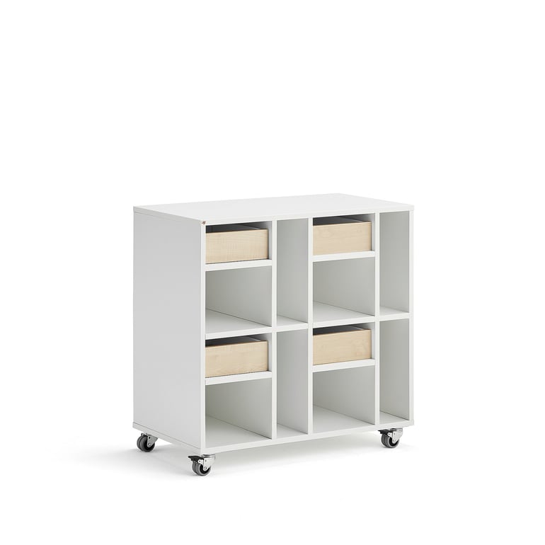Mobilny mebel do przechowywania papieru, ołówków, książek i innych materiałów szkolnych. Regał wyposażono w otwarte przegrody, miejsca na foldery i inteligentne szuflady na papier w formacie A4. Wykonany z wytrzymałego laminatu i wyposażony w blokowane koła. Ten mobilny mebel jest idealny do przechowywania rzeczy uczniów w salach lekcyjnych. Kompaktowy rozmiar zapewnia dużo miejsca do przechowywania na niewielkiej powierzchni. Dzięki prostej konstrukcji może być wykorzystany w większości środowisk szkolnych.