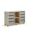 Posiada otwarte półki i funkcjonalne szuflady na papier, książki, ołówki i podobne materiały szkolne. Uczniowie mogą dzielić przegrody lub można je przypisać każdemu uczniowi z osobna. Mebel idealnie spełnia swoje zadanie również jako tradycyjna jednostka do przechowywania dla całej klasy.