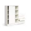 Ta praktyczna kombinacja mebli zapewnia wiele możliwości przechowywania dzięki szafie, półkom i szufladom. Wysoka szafa jest wyposażona w zamykane drzwi przesuwne, które zapewniają oszczędność miejsca.