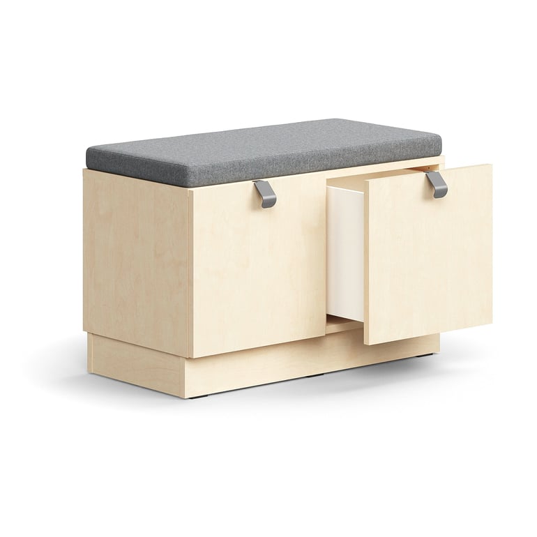 Siedzisko ze schowkami QBUS, cokół, otwieranie push-open, 534x800x420 mm, brzoza, szara poduszka