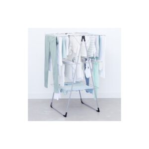 Stojąca suszarka na pranie o dużej powierzchni roboczej. Zaprojektowana tak, by po złożeniu zajmowała jak najmniej miejsca. Rozłożona z powodzeniem zmieści duże, rodzinne pranie.