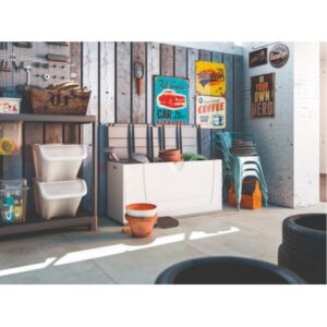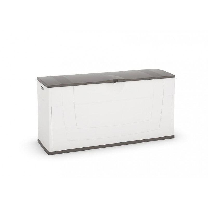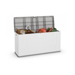 Skrzynia ogrodowa KARISMA o pojemności 276L w kolorze białym z akcentami szarości na klapie i spodzie. Włoski projekt – atrakcyjny, nowoczesny, praktyczny i elegancki. Pokrywa białej skrzyni ogrodowej posiada ucho do założenia kłódki (brak w zestawie). Skrzynię montuję się szybko i prosto bez użycia narzędzi, każdy użytkownik sobie z tym poradzi. Biała skrzynia ogrodowa została wykonana z tworzywa sztucznego.