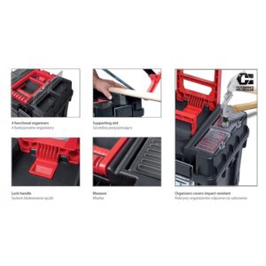 Jest to możliwe dzięki przemyślanej, wzmocnionej konstrukcji tej skrzynki. Plastikowe kółka zabezpieczone warstwą gumy sprawiają, że przenoszenie narzędzi nie będzie sprawiać problemu. Dzięki poręcznej rączce jest łatwa w transporcie. Szerokie zapięcia i możliwość zamontowania kłódki zabezpieczającej zawartości skrzyni na wypadek kradzieży. Zaprojektowana by optymalnie wykorzystać dostępne miejsce. Dodatkowe organizery w pokrywie pomogą uporządkować najmniejsze akcesoria.