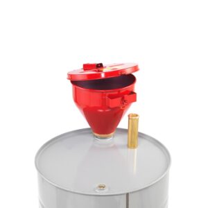 Stalowy lejek z automatycznie zamykaną pokrywą.