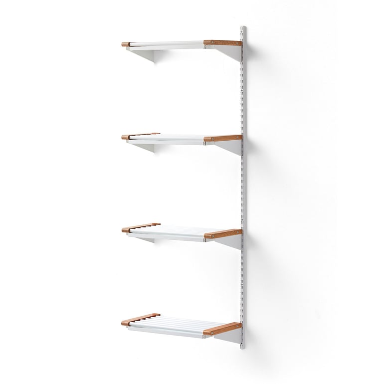 Moduł dodatkowy do systemu regałów JEPPE. Jeden słupek ścienny i półki z rur z ociekaczami. Wymaga modułu podstawowego. Rozbuduj swój stojak na buty JEPPE za pomocą tego dodatkowego elementu z malowanej blachy!