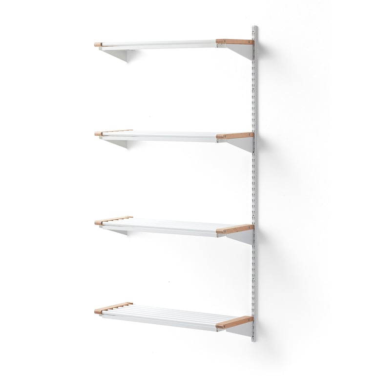 Moduł dodatkowy do systemu regałów na buty JEPPE. Jeden słupek ścienny i półki z rur z ociekaczami. Wymaga modułu podstawowego. Rozbuduj swój stojak na buty JEPPE za pomocą tego dodatkowego elementu z malowanej blachy!