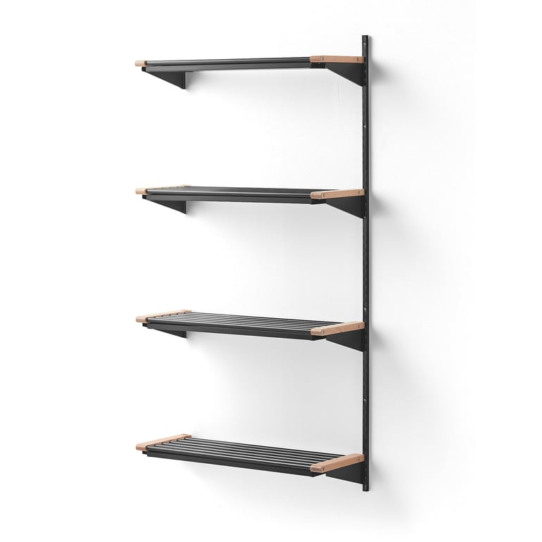 Moduł dodatkowy do systemu regałów na buty JEPPE. Jeden słupek ścienny i półki z rur z ociekaczami. Wymaga modułu podstawowego. Rozbuduj swój stojak na buty JEPPE za pomocą tego dodatkowego elementu z malowanej blachy!