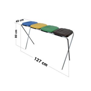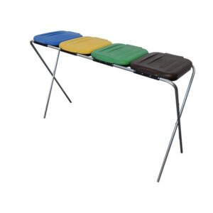 Stojak na worki do segregacji śmieci posiada funkcjonalne klapy w 4 kolorach o wysokiej jakości tworzywa sztucznego adekwatnych do rodzaju segregacji, ogólnie przyjętej w UE (zielony, niebieski, żółty, brąz).