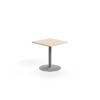 Kwadratowy blat z laminatu wysokociśnieniowego HPL zapewnia gładką, twardą i wytrzymałą powierzchnię. Laminat jest łatwy do utrzymania w czystości i umożliwia szybkie usunięcie śladów po filiżankach i kubkach. Podstawa zakończona jest dużą, okrągłą stopą, dzięki której stół jest stabilny.