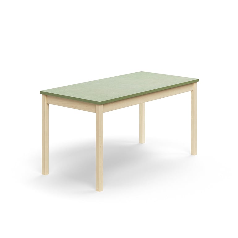 Stół z ramą z litej brzozy i blatem tłumiącym dźwięk, pokrytym przyjaznym dla środowiska linoleum. Stół DECIBEL o klasycznym designie, z blatem o właściwościach tłumiących hałas. Doskonałe rozwiązanie do szkół i przedszkoli. Tłumi dźwięk i pomaga stworzyć bardziej przyjazne otoczenie. Spełnia wymogi dla mebli szkolnych – jest niezwykle trwały i przyjazny dla użytkowników. Trwała rama z litego drewna o dużej odporności na uszkodzenia kontaktowe. Blat pokryty linoleum, które jest wytrzymałe i łatwe w czyszczeniu. Linoleum to materiał przyjazny dla środowiska, wykonany z naturalnych tworzyw, nadających się do recyklingu. W porówniau z innymi materiałami, posiada znacznie mniejszy ślad węglowy. Linoleum używane przez AJ Produkty spełnia wymagania certyfikatu Nordic Ecolabel i posiada doskonałe właściwości tłumiące hałas. Blat jest dostępny w wielu kolorach, co sprawia, że stół łatwo dopasować do posiadanych już mebli.