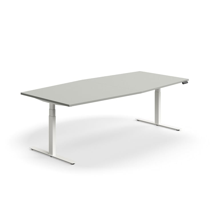 Stół konferencyjny z regulacją wysokości, kształt łodzi, 2400×1200 mm, biała rama, jasnoszary