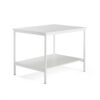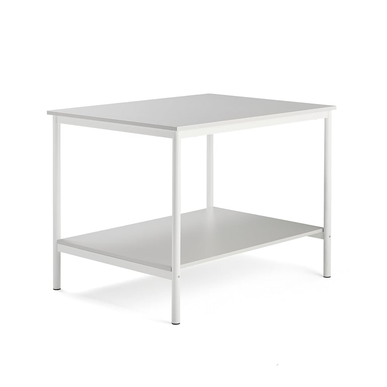 Solidny, wszechstronny stół roboczy z dużą półką pod blatem. Idealne rozwiązanie do sal lekcyjnych lub szkolnych szwalni. Może być również używany jako dodatkowy stół lub jako miejsce do przechowywania. Półka dolna to praktyczne miejsce na pomoce szkolne lub rzeczy osobiste. Bardzo wytrzymały, użyteczny stół roboczy z półką pod blatem. Stół doskonale współpracuje z naszym stołem szwalniczym i stanowi idealną dodatkową powierzchnię roboczą, na przykład w salach lekcyjnych, szwalniach i innych pomieszczeniach roboczych. Blat wykonano z trwałego i stylowego laminatu, który jest łatwy do utrzymania w czystości. Stół roboczy jest dostarczany w stanie do samodzielnego montażu i jest dostępny z białą lub srebrną ramą.
