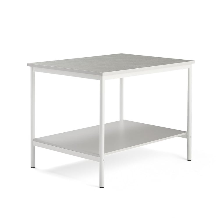 Solidny, wszechstronny stół roboczy z dużą półką pod blatem. Idealne rozwiązanie do sal lekcyjnych lub szkolnych szwalni. Może być również używany jako dodatkowy stół lub do przechowywania. Półka pod spodem to praktyczne miejsce do przechowywania materiałów szkolnych lub rzeczy osobistych. Bardzo wytrzymały, użyteczny stół roboczy z półką pod blatem. Stół doskonale współpracuje z naszym stołem do wykrojów i stanowi idealną dodatkową powierzchnię roboczą, na przykład w salach lekcyjnych, szwalniach i innych pomieszczeniach roboczych. Blat stołu wykonany jest z linoleum tłumiącego hałas z oznakowaniem Nordic Swan Ecolabel. Skutecznie pochłania dźwięk i pomaga stworzyć komfortowe środowisko pracy. Stół roboczy jest dostarczany w stanie do samodzielnego montażu i jest dostępny z białą lub srebrną ramą.
