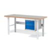 Stół warsztatowy z ręczną regulacją wysokości. Wyposażony w podwieszoną szafkę z 3 szufladami, zamkiem i 2 kluczami. Praktyczne rozwiązanie, jeśli szukasz wytrzymałego stołu warsztatowego z miejscem do przechowywania. Stół zaprojektowany specjalnie do użytkowania w wymagających środowiskach, takich jak warsztaty, fabryki itp. Szafka z szufladami jest łatwa do zamontowania pod blatem i zapewnia dobry dostęp do przedmiotów niezbędnych w codziennej pracy.