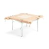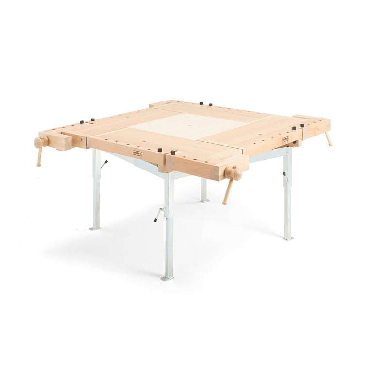 Stół ciesielsko-stolarski z czterema lakierowanymi blatami i imadłem. Rama z regulacją wysokości. W zestawie znajdują się kołki stolarskie. Ten stół stolarski z czterema powierzchniami roboczymi stanowi kompletne rozwiązanie dla pracowni stolarskiej. Rama o regulowanej wysokości pozwala dopasować wysokość roboczą, tak aby pozycja robocza była maksymalnie wygodna. Konstrukcja stojaka zapewnia maksymalną ilość miejsca na nogi pod blatami.