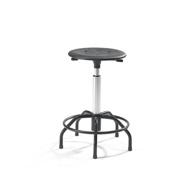 Stołek przemysłowy z profilowanym siedziskiem z materiału odpornego na iskry spawalnicze. Wyposażony w podnóżek i mechanizm regulacji wysokości. Trwała konstrukcja sprawia, że stołek sprawdzi się w trudnych środowiskach. Stołek przemysłowy zaprojektowany specjalnie do użytku w halach spawalniczych. Wykonany z materiałów odpornych na iskry spawalnicze.