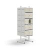 Ta dwustronna szafka na obuwie jest wyposażona w dwie ramy w kształcie litery T i stężenia, które są łatwe w montażu. Perforacje w ramie ułatwiają regulację odstępów między półkami i umożliwiają zmianę ich rozmieszczenia w zależności od potrzeb.